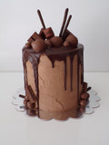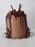 Indulge in this 6-inch round chocolate cake, crafted for true chocolate enthusiasts. It features moist, delicate layers of chocolate cake paired with smooth Swiss meringue buttercream. Finished with a luscious chocolate drip and adorned with an assortment of chocolate candy bars, this cake offers a sophisticated and richly satisfying experience for any chocolate connoisseur.