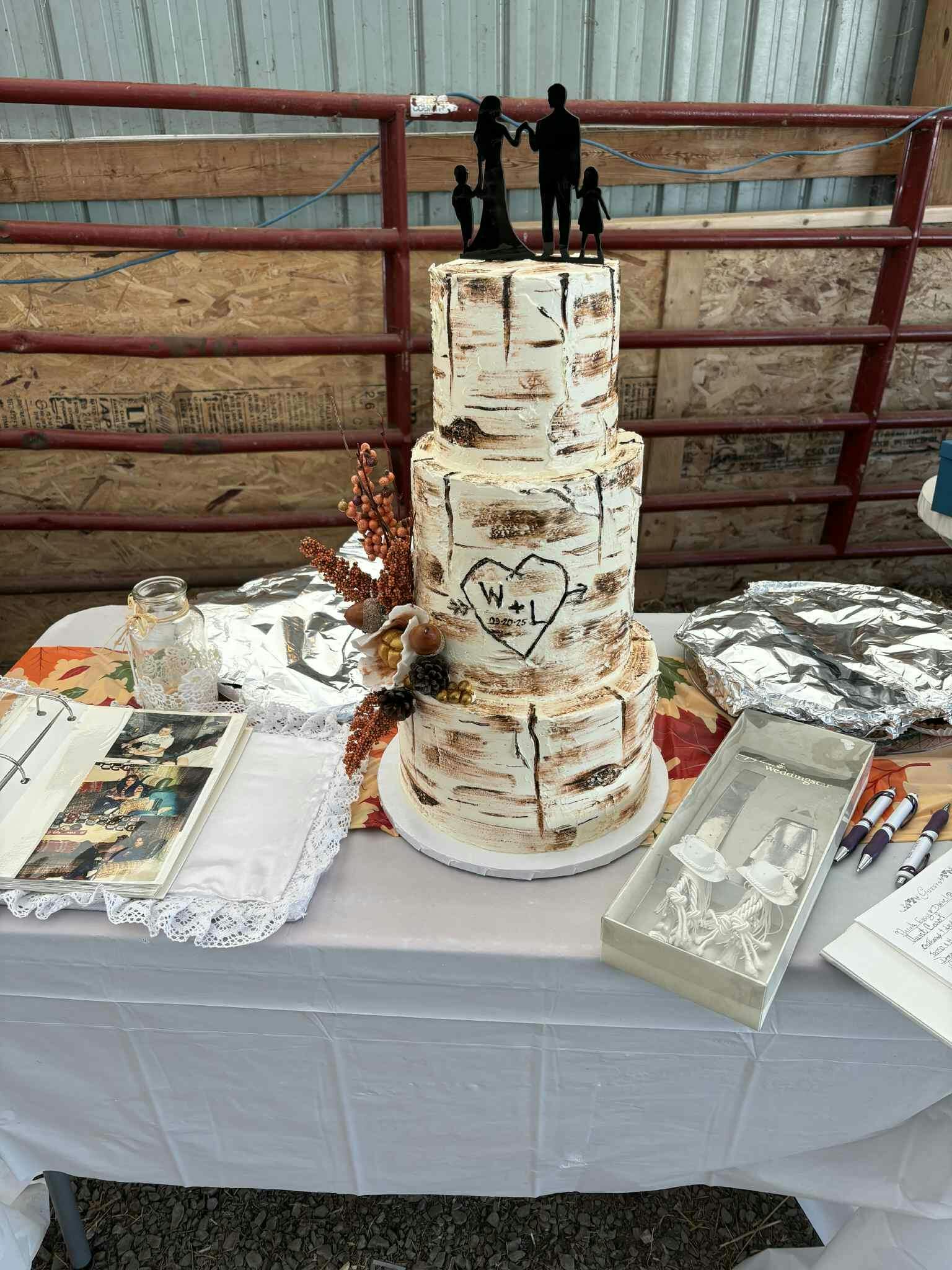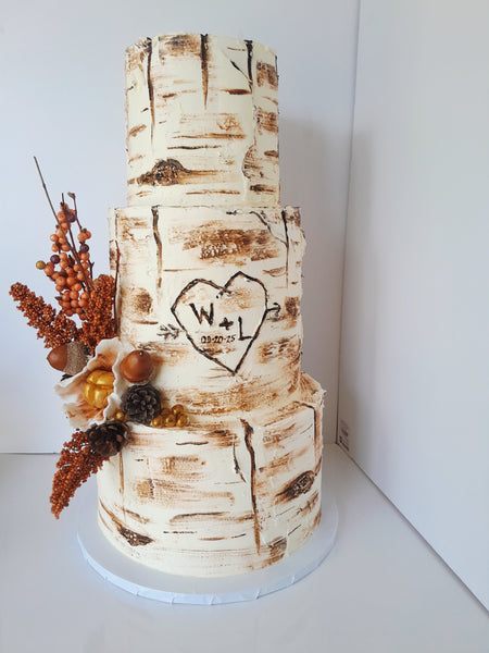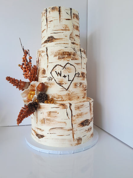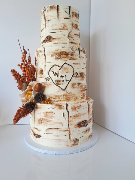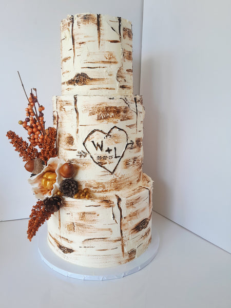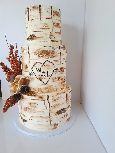 • *birch tree cake,  3 tier round with carved heart and initials in tree