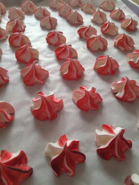 Meringues! Meringues! Meringues! 24 delicious, light as air, melt in your mouth, crunchy treats. They are the perfect low cal, gluten free sweet indulgence. Perfectly piped swirls offered in a variety of colours. They make a great addition to a dessert display, as a gift, or just for your own sweet tooth. We offer a wide variety of colors to suit your event theme. Great for wedding dessert buffets, bridal showers or anytime. We can also prepare party favours for your guests. Additional customized gift tags can be made for an extra charge.
